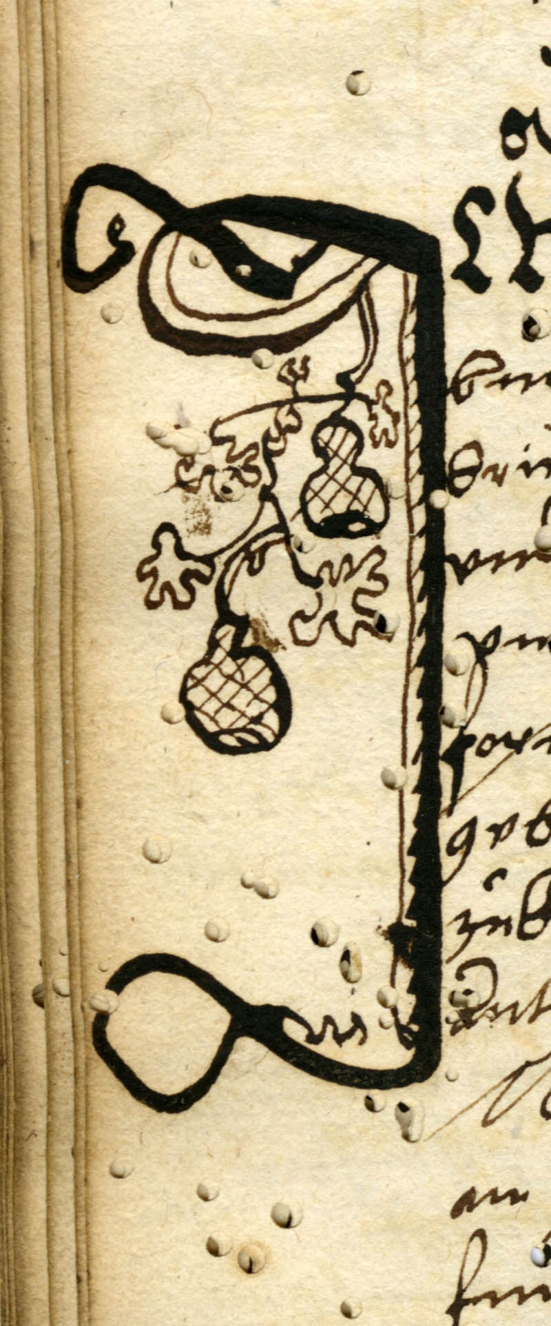 Initiale „I“ mit der bislang ältesten bekannten Abbildung eines Bocksbeutels in einem Kopiar von 1551 oder unmittelbar später (StadtAW BSP/8, fol. 75v, Foto: Ingrid Rack).