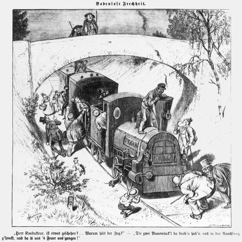 Bodenlose Frechheit – A Bauernlackl hat von einer Brücke in den Kamin einer Lokalbahn gespuckt, Zug bleibt stehen … (DB Museum Nürnberg, 2022.002186) HLB