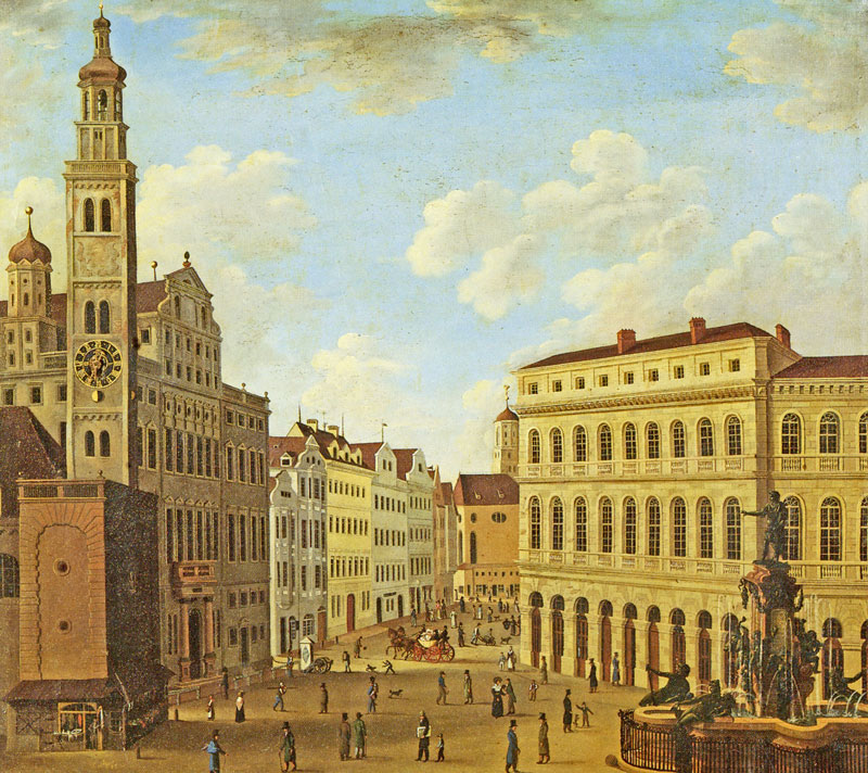 Börsengebäude gegenüber dem Augsburger Rathaus, Gemälde von Georg Ulbricht, um 1830. (Städtische Kunstsammlungen Augsburg; Druck: Bayerisch-Schwäbische Wirtschaft 48/5 (1993), Titelblatt) HLB