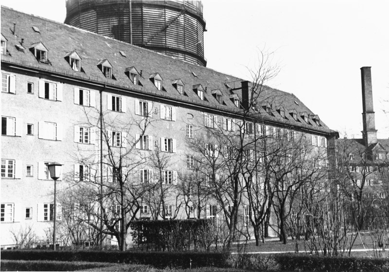 Wohnblock der Borstei, Gasspeicher, Städtisches Gaswerk; Kriegszerstörungen 1945. Fotograf: Johann Vorzellner. (Bayerische Staatsbibliothek, hoff-65702) HLB