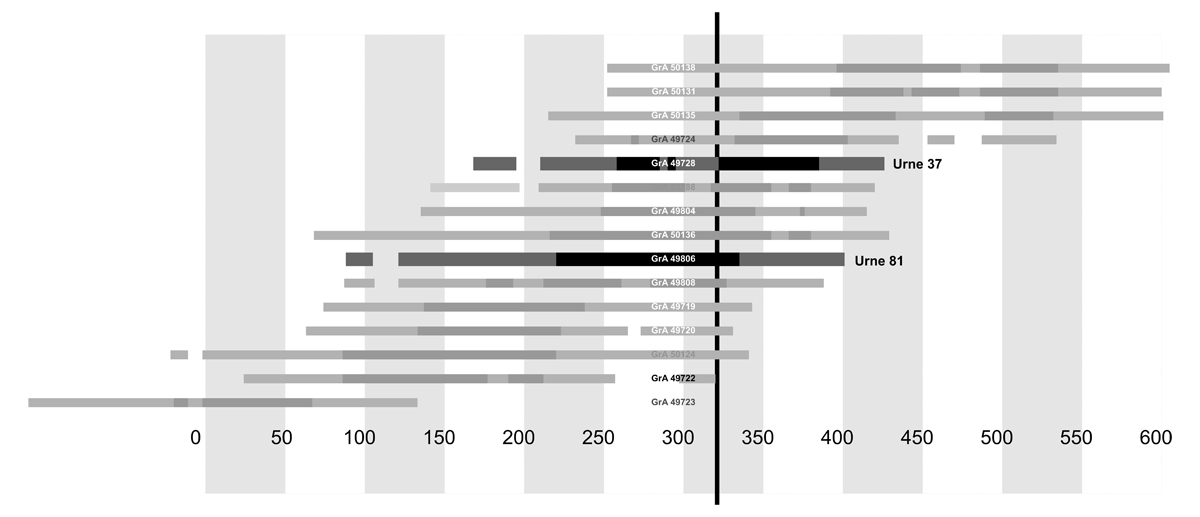 Serie aus dem Brandgräberfeld von Forchheim/Opf.; schwarze Balken: oval facettierte Gefäße. (Abb. aus: Raimund Masanz: Völkerwanderungszeitliche Brandgräber aus Freystadt-Forchheim (Oberpfalz). Ein Beitrag zum Problem der „Gruppe Friedenhain-Přešťovice", Kallmünz 2017.) HLB