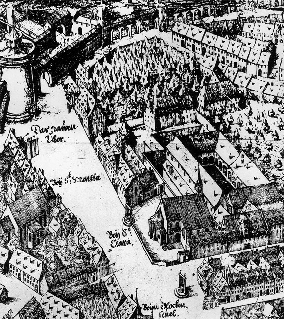 Darstellung des Klarissenklosters mit der Kirche St. Klara von 1608. Ausschnitt aus dem Prospekt der Reichsstadt Nürnberg von Hieronymus Braun (1566-1620). (gemeinfrei via Wikimedia Commons HLB