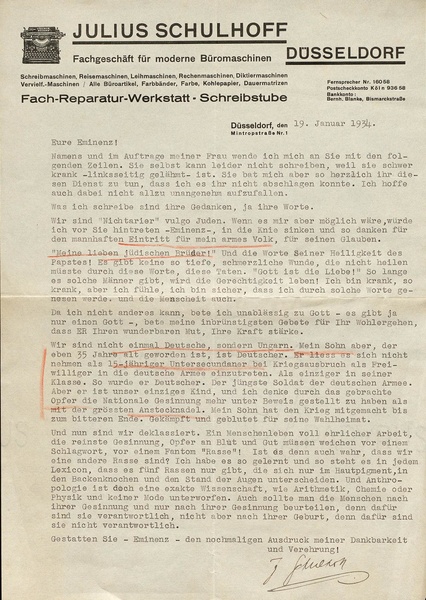 Brief von Julius Schulhoff an Kardinal Faulhaber, 19. Januar 1934. (Erzbischöfliches Archiv München, Nachlass Faulhaber, 9375) HLB