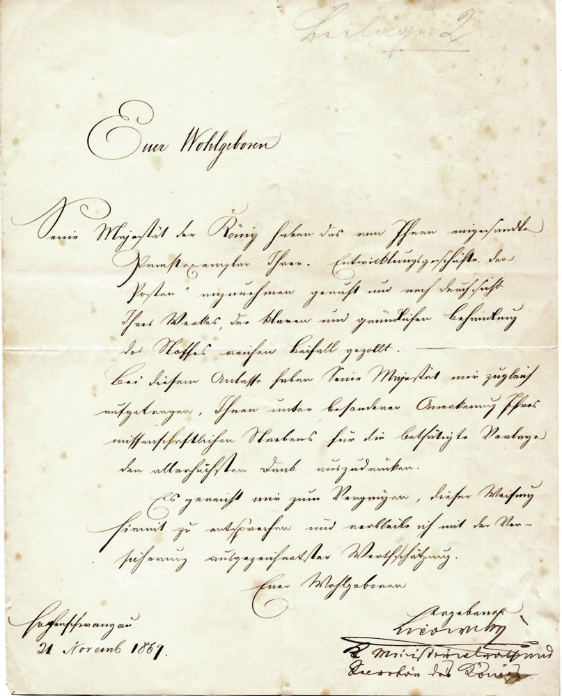 Brief des Kabinettssekretärs Felix Friedrich Ritter von Lipowsky (1824-1900) an den Autor Eugen Hartmann, Hohenschwangau 21.11.1869. (gemeinfrei via Wikimedia Commons) HLB