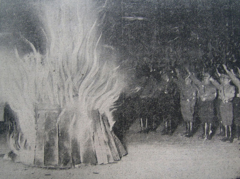 Bücherverbrennung auf dem Münchner Königsplatz am 6. Mai 1933. (Abb. aus: Völkischer Beobachter, Süddeutsche Ausgabe. München 12.5.1933, Beiblatt) HLB