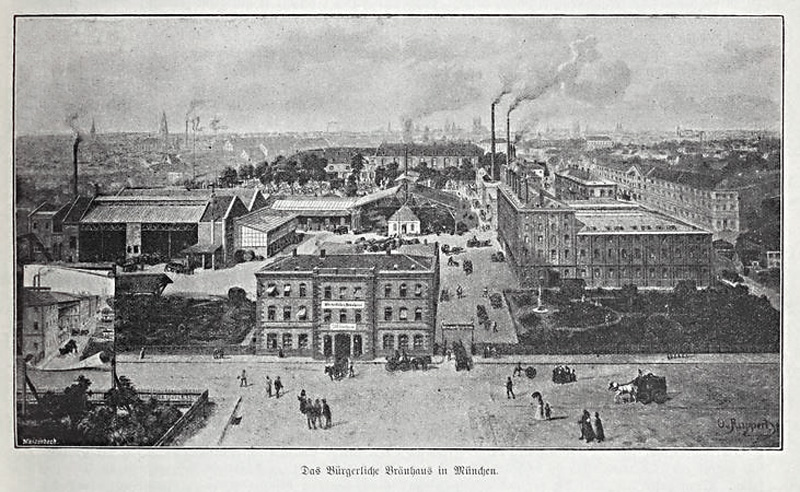 Das Bürgerliche Bräuhaus in München, eröffnet 1885. Abb. aus: Das Bayerland. Illustrierte Wochenschrift für bayerische Geschichte und Landeskunde 2, 1891, 257. (Bayerische Staatsbibliothek, 4 Bavar. 198 t-2) HLB