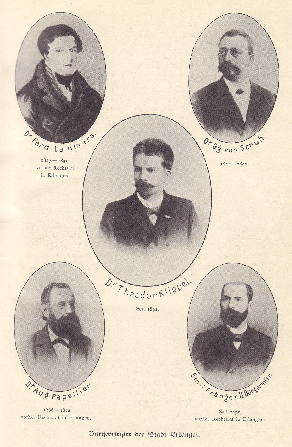 Repräsentative Darstellung der Bürgermeister der Stadt Erlangen im 19. Jahrhundert in einer Darstellung der Stadtgeschichte von 1898. Abb. aus: Stein u. Müller, Die Geschichte von Erlangen in Wort und Bild, Erlangen 1898, v. 1 (Bayerische Staatsbibliothek, Bavar. 2537 fqr)