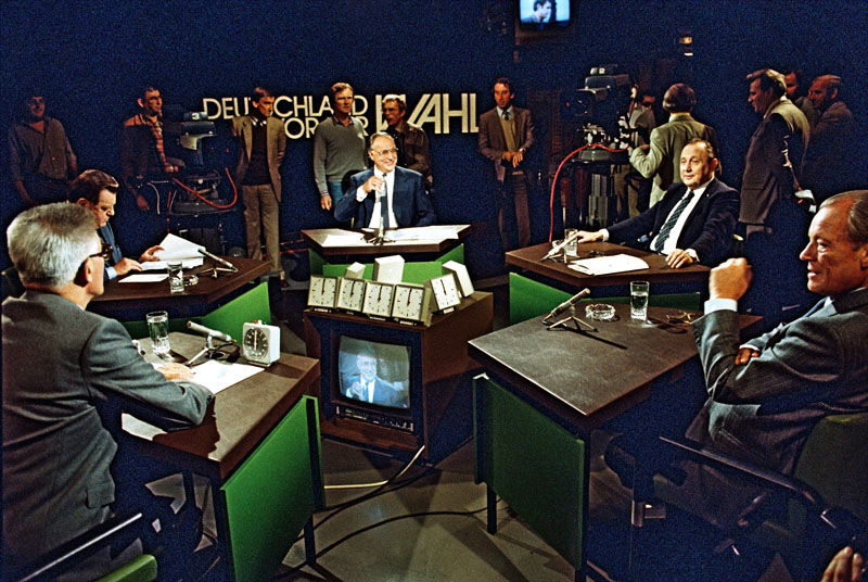 {{|1=Zur Bundestagswahl 1980 findet im ARD-Studio Bonn eine Diskussionsrunde mit Vertretern der im Deutschen Bundestag repräsentierten Parteien statt, die als Fernsehsendung "Deutschland vor der Wahl" ausgestrahlt wird. Im Bild: die vier Parteivorsitzenden, im Uhrzeigersinn 2.v.l.: der CDU/CSU-Kanzlerkandidat Franz-Josef Strauß (CSU), Helmut Kohl (CDU), Hans-Dietrich Genscher (FDP), Willy Brandt (SPD) und der ARD-Moderator. (Bild: Bundesarchiv, B 145 Bild-00174682)}}