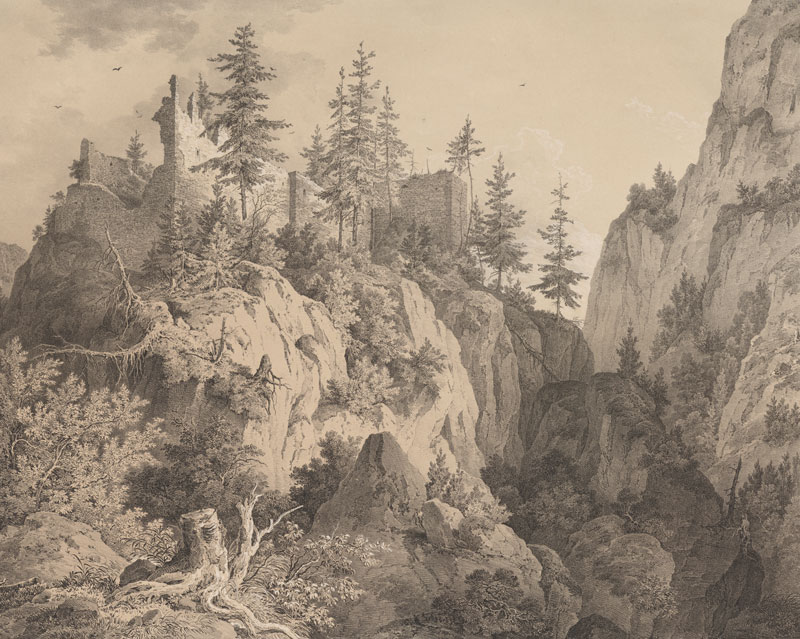 Ruine von Burg Hohenschwangau. Lithographie von Karl August Lebschée (1800-1877) nach einer Zeichnung von Domenico Quaglio (1787-1837), 1844-1846. (Bayerische Staatsbibliothek, Bildarchiv port-018977) HLB