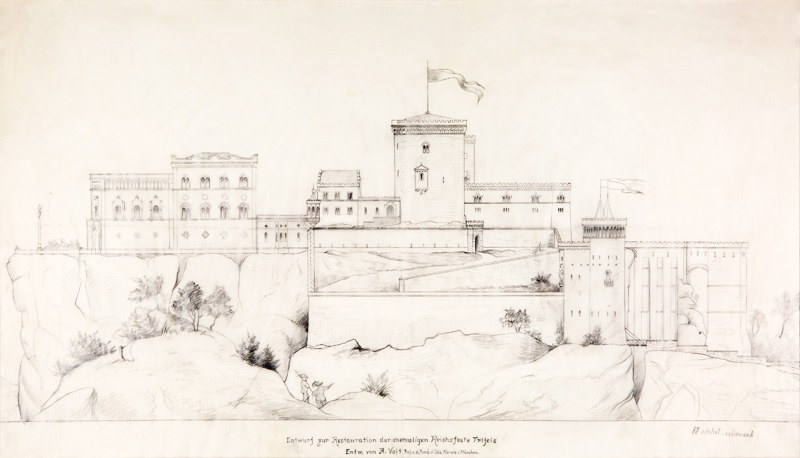 Zeichnung eines Rekonstruktionsversuchs der Burg Trifels zur Zeit der Stauferkaiser vom Münchner Architekten und Denkmalpfleger August von Voit (1801-1870). Die Zeichnung datiert ins Jahr 1851 und ist ein Beispiel für den rekonstruierenden Historismus in der Denkmalpflege des 19. Jahrhunderts. Abb. aus: Helmut Seebach, Kleine Geschichte des Trifels und der Stadt Annweiler, Leinfelden-Echterdingen/Karlsruhe 2009, 27-28. (Historisches Museum der Pfalz Speyer, Fotografin: Carolin Breckle) HLB
