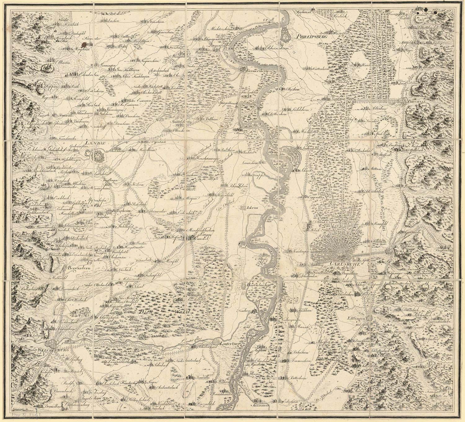 Zweiter Teil der Charta Palatina des Mannheimer Hofastronomen und Kartographen Christian Mayer (1719-1783), (Bayerischen Staatsbibliothek Mapp. XI,831-1/2)