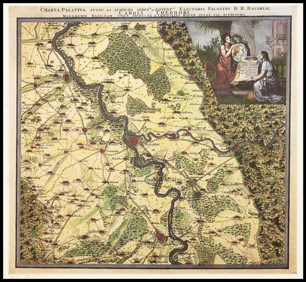 Charta Palatina des Mannheimer Hofastronomen und Kartographen Christian Mayer (1719-1783), Farb-Lithographie Mannheim 1774-1776 (Universitätsbibliothek Heidelberg lizensiert via CC-BY-SA 4.0). Eine vergrößerbare nicht colorierte Fassung findet sich in der [ http://daten.digitale-sammlungen.de/bsb00090795/image_1 Bayerischen Staatsbibliothek].