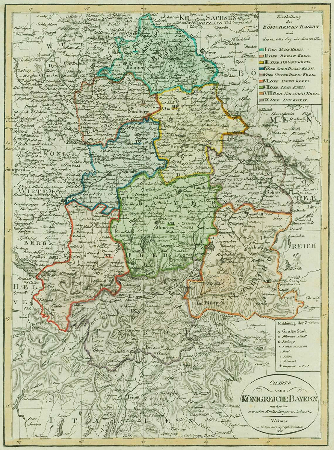 Charte vom Königreiche Bayern nach seiner neuesten Eintheilung vom Jahre 1810. Verlag des geographischen Instituts Weimar (Bayerische Staatsbibliothek, Mapp. XI,53 d)