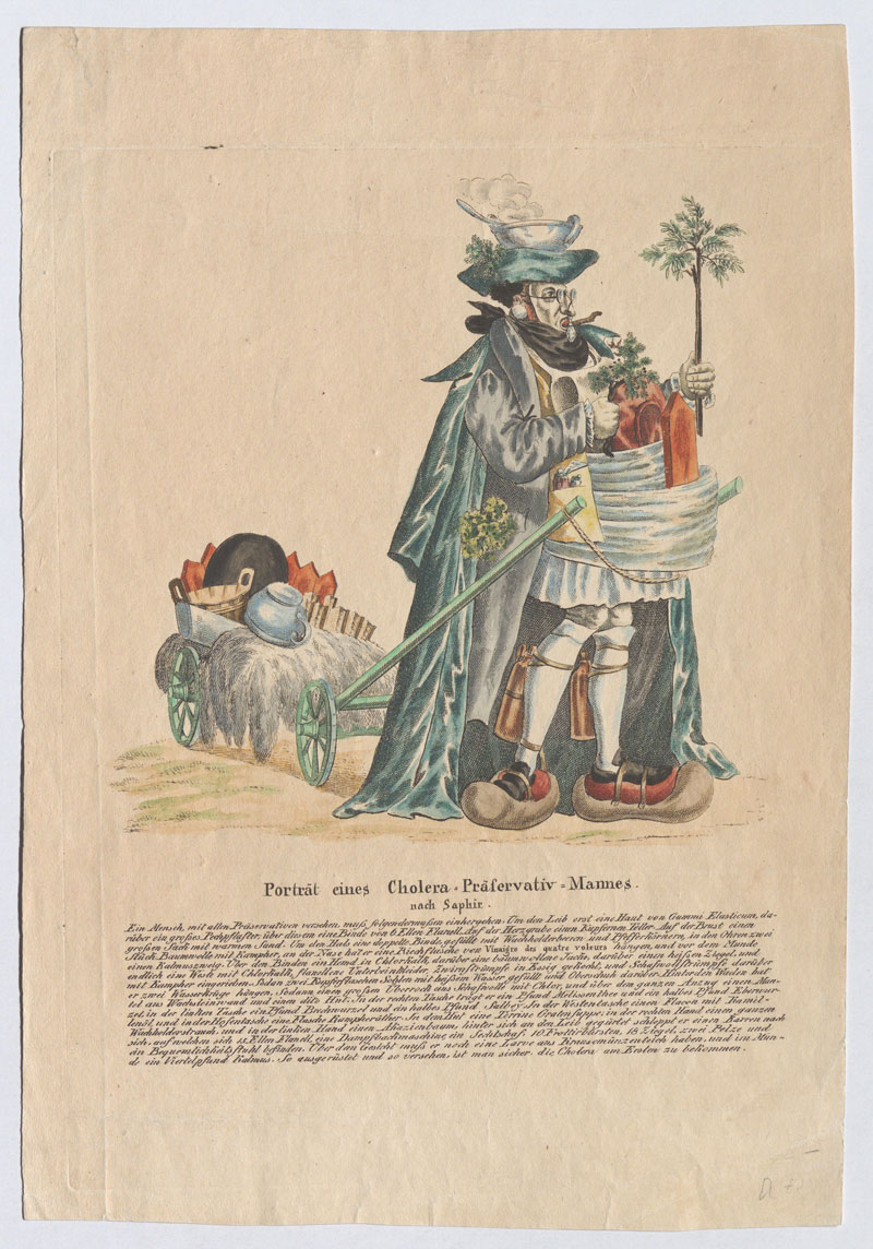 Karikatur auf Maßnahmen zur Cholera-Prävention: Porträt eines Cholera-Präservativ-Mannes. Kolorierter Kupferstich nach Moritz G. Saphir (1795-1858), Wien Museum, 1831. (Wien Museum via CC0) HLB