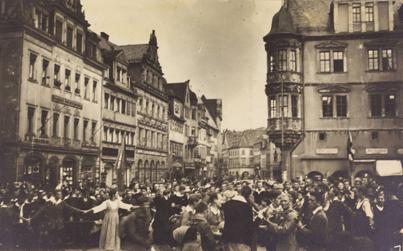 Tanz und Spiele von Wandervögeln und Soldaten auf dem Marktplatz beim Bundestag des Wandervogel e. V. in Coburg, 2.-4.8.1919, Fotograf: Julius Groß. (Archiv der deutschen Jugendbewegung, Signatur: AdJb _F1_111_54)