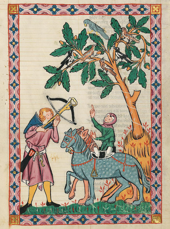 Diese Miniatur aus dem Codex Manesse zeigt den Minnesänger Kol von Nüssen - seine Minnelieder entstanden wohl um 1230 bis 1250 - als Armbrustschützen auf der Beizjagd. (Universitätsbibliothek Heidelberg, Cod. Pal. germ. 848, Bl. 396r)