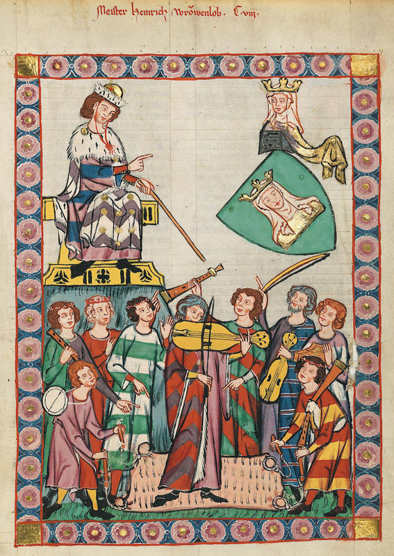 Darstellung des Minnesängers Heinrich von Meißen (geb. um 1250) im Codex Manesse (entstanden in Zürich 1300-1340) als "Meister Heinrich Frauenlob". (Universitätsbibliothek Heidelberg, Cod. Pal. germ. 848, Bl. 399r)