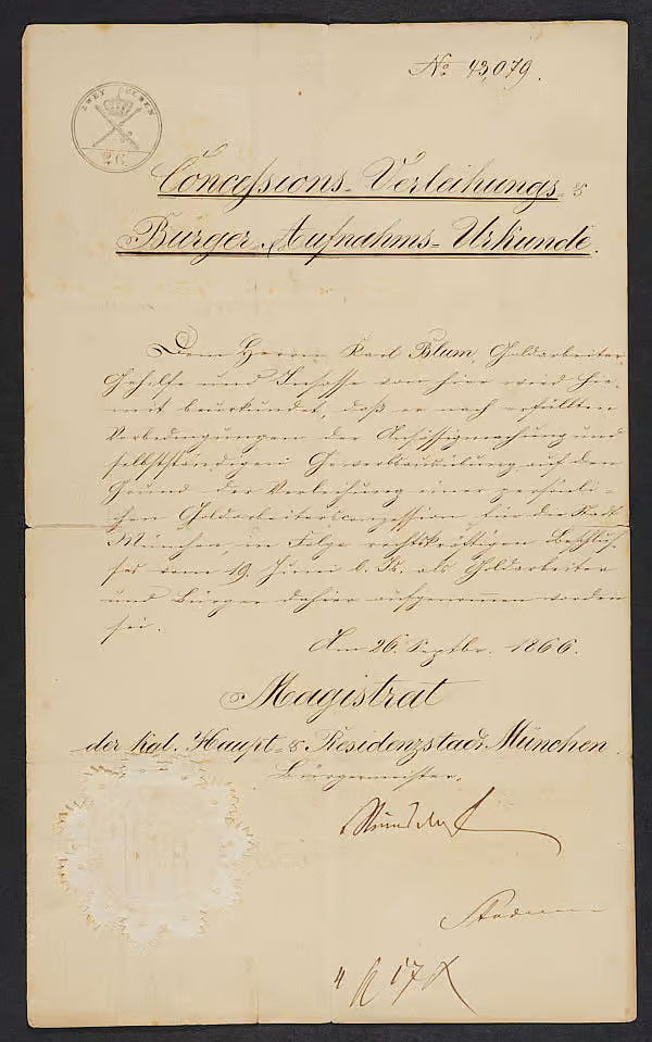 Concessions-Verleihungs- und Bürger-Aufnahms-Urkunde des Stadtmagistrat Münchens für Karl Blum, 1866. (Bayerisches Nationalmuseum, 93/42.7 lizenziert durch CC BY-NC-ND 4.0) HLB