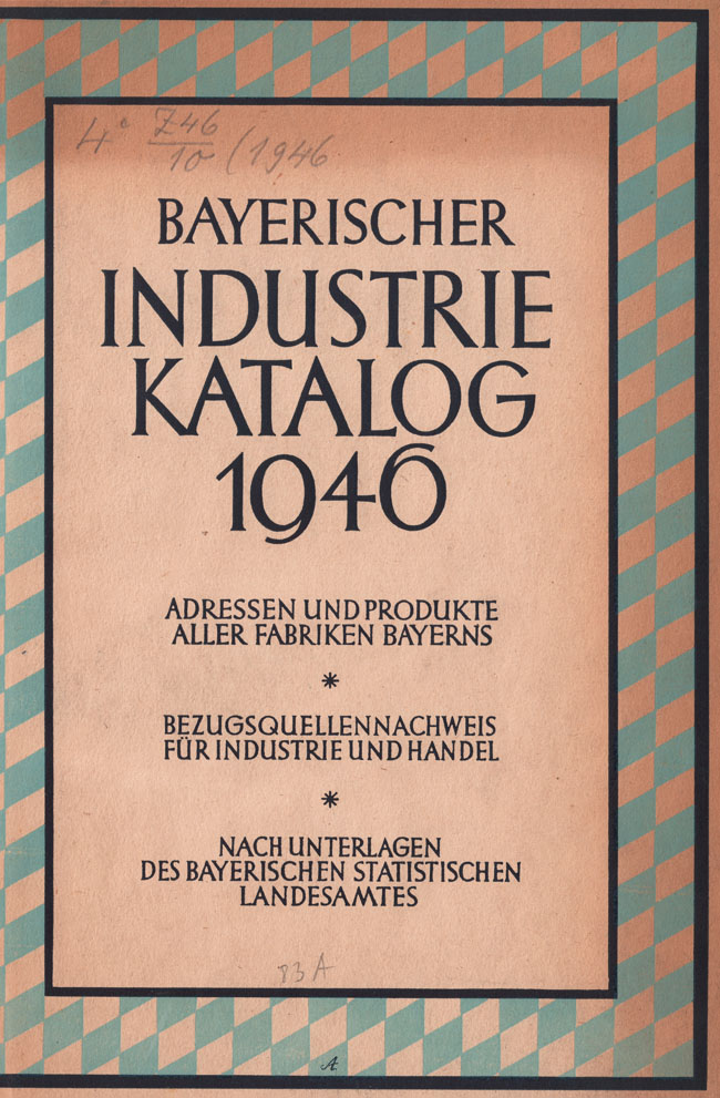 Der "Bayerischer Industriekatalog" wurde vom Statistischen Landesamt herausgegeben. Er umfasst über 6500 Einträge von Firmen, die ihren Betrieb wieder aufgenommen hatten und für die "Bedarfsdeckung" der Bevölkerung vorgesehen waren. (Bayerische Staatsbibliothek, 4 Z 46.10-1946)