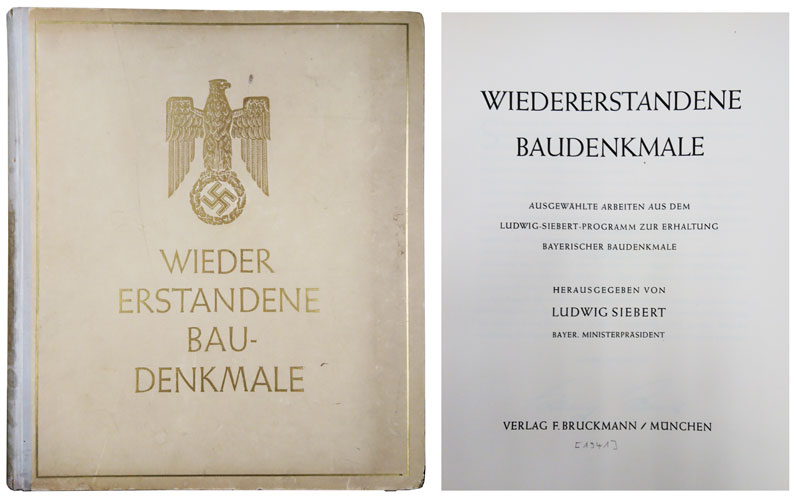 Buchcover und Titelblatt des Buches. Ludwig Siebert (Hg.), Wiedererstandene Baudenkmale. Ausgewählte Arbeiten aus dem Ludwig-Siebert-Programm zur Erhaltung Bayerischer Baudenkmale, München 1941. (Bayerische Staatsbibliothek, 2 81.118)