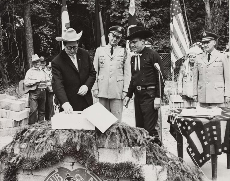 Grundsteinlegung des CCM-Saloons am 22.07.1961. Mit dabei der damalige Oberbürgermeister Hans Jochen Vogel (SPD) mit Cowboyhut, rechts daneben Generalmajor John F. R. Seitz, der Vorsitzende des CCM Kurt Nöbauer („Jeff Carter“; in schwarz gekleidet), welcher den Brigadegeneral Koller-Kraus von der Bundeswehr verdeckt. Dahinter das CCM-Mitglied Josef Lössl („Joe Collins“) im Indianerkostüm sowie ganz rechts Lt. Col. Joseph T. Barnes. Links im Hintergrund die Westernband des Vereins. (Foto: Cowboy Club München)