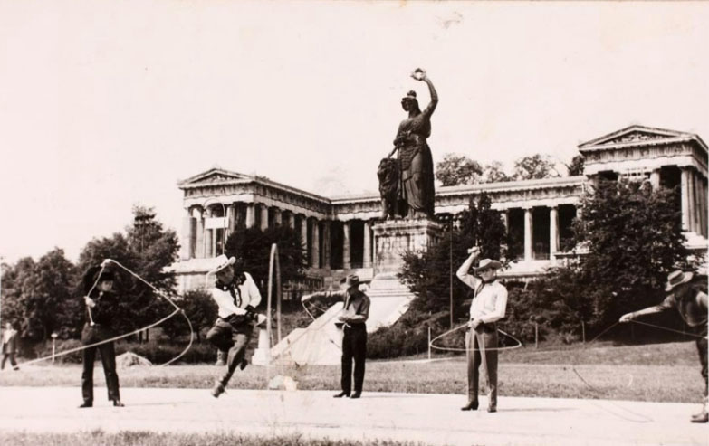 Mitglieder des Cowboy Club München üben sich auf der Münchner Theresienwiese im Lassodrehen. Aufnahme um 1956. (Foto: Cowboy Club München)