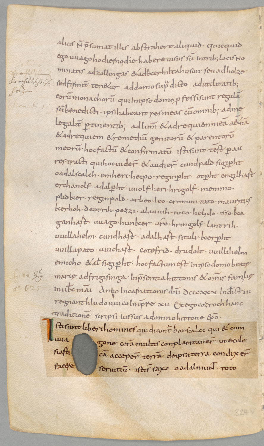 Im Rahmen einer Schenkung des Kaplans Uuago an die Freisinger Domkirche am 20. April 825 werden detailierte Vereinbarungen zur Bewirtschaftung kirchlichen Gütern durch Barschalken getroffen (markierte Stelle). Auszug aus dem Cozroh-Codex, Freising 9. Jh., fol. 324v. (Regestenedition von Adelheid Krah) (Bayerisches Hauptstaatsarchiv, HL Freising 3a, Freising, 824 lizensiert durch CC BY-NC-SA 4.0)