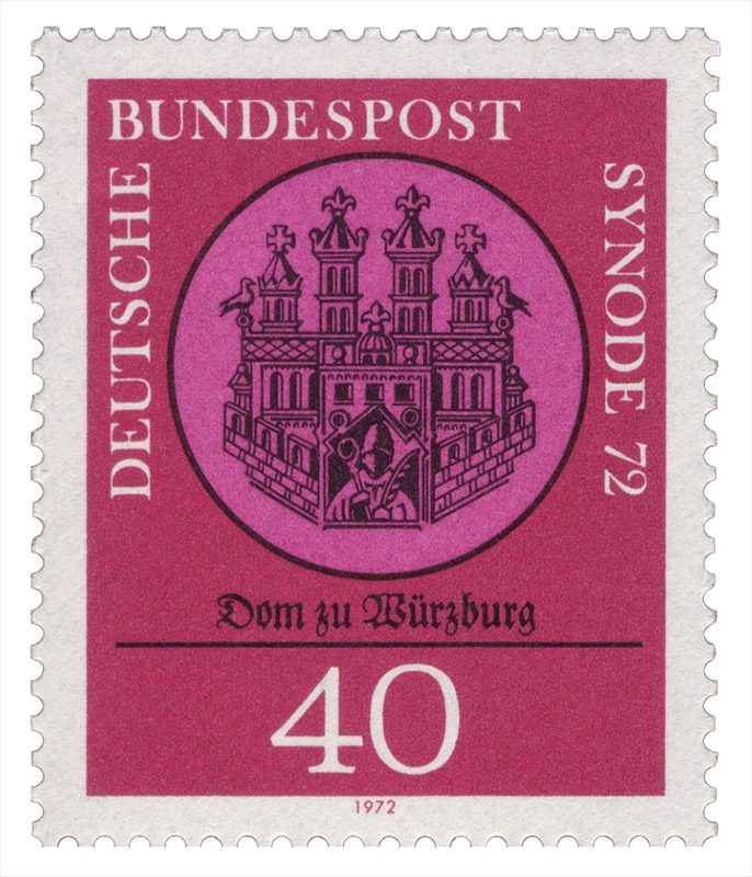 Sonderbriefmarke der Deutschen Bundespost aus dem Jahr 1972 zur Würzburger Synode mit dem Würzburger Stadtsiegel und dem Würzburger Dom. (Gemeinfrei via Wikimedia Commons) HLB