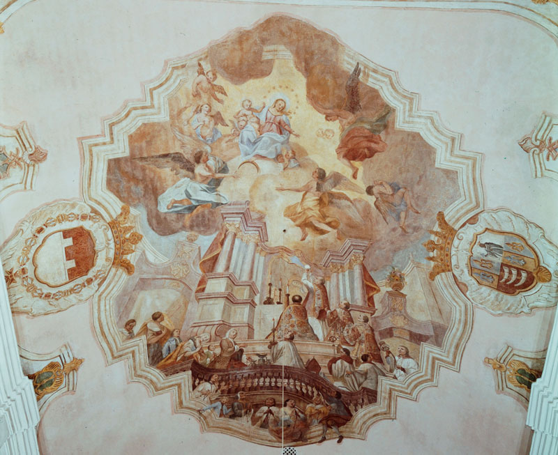 Deckengemälde im Chor der Pfarrkirche St. Korbinian in Reichersbeuern. Wilhelm Anton Fett (1739-1800). Die Rahmung des Deckengemäldes flankieren die Wappen der Familien Preysing und Fugger. (Deutsches Dokumentationszentrum für Kunstgeschichte - Bildarchiv Foto Marburg, Bestand Corpus der Barocken Deckenmalerei, Foto: Wolf Christian von der Mülbe, 1971) HLB