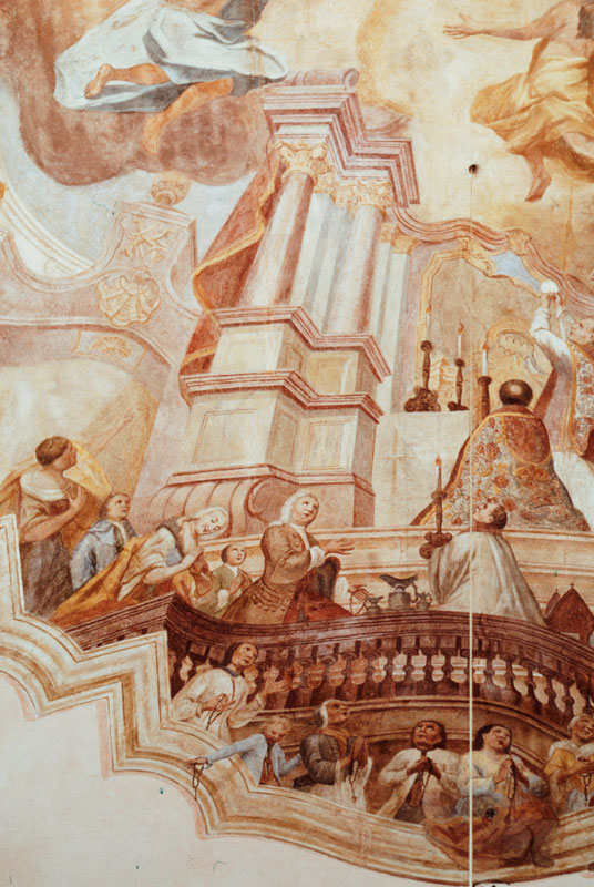 Deckengemälde im Chor der Pfarrkirche St. Korbinian in Reichbeuern, Detail. Wilhelm Anton Fett (1739-1800). Über der Balustrade im unteren Bildtitel links kniend Graf Max IV. von Preysing, dahinter mit geneigtem Kopf seiner Gattin Maria Theresia Anna geb. Gräfin von Fugger. (Deutsches Dokumentationszentrum für Kunstgeschichte - Bildarchiv Foto Marburg, Bestand Corpus der Barocken Deckenmalerei, Foto: Wolf Christian von der Mülbe, 1971) HLB