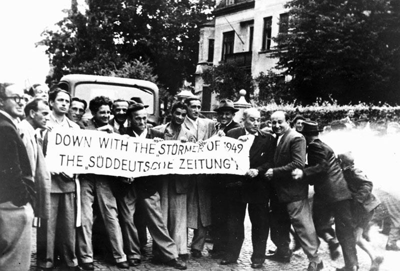 Demonstration jüdischer Anwohner 10. August 1949 gegen einen antijüdischen Leserbrief in der Süddeutschen Zeitung: "Down with the "Stürmer" of 1949 the "Süddeutsche Zeitung". (Bayerische Staatsbibliothek, Bildarchiv hoff-61143)