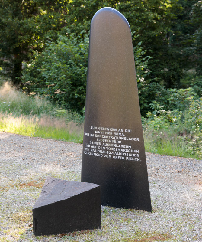 2016 errichtetes Denkmal zur Erinnerung an die ermordeten Sinti und Roma im Lagerkomplex Flossenbürg in der Gedenkanlage Tal des Todes. Bildhauer: Alfred Kainz. (KZ-Gedenkstätte Flossenbürg, Foto: Thomas Dashuber) HLB