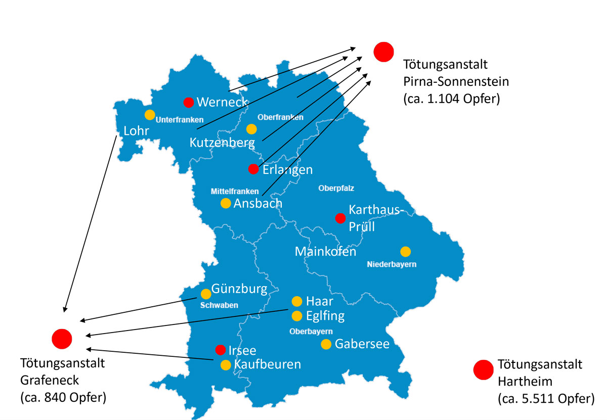 Aus den bayerischen Heil- und Pflegeanstalten gingen Tötungstransporte nach Grafeneck (18. Januar 1940 bis 9. Dezember 1941), nach Pirna-Sonnenstein (2. Oktober 1940 bis 28. Februar 1941) und nach Hartheim (30. August 1940 bis 4. Juni 1941) (Gestaltung Katrin Kasparek. Kartenvorlage: Bayerisches Innenministerium).. HLB