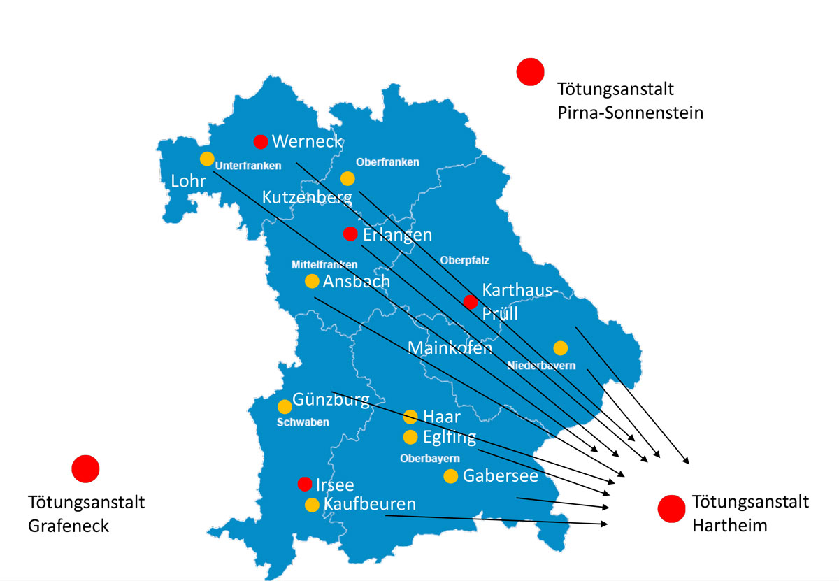 Aus den bayerischen Heil- und Pflegeanstalten gingen Tötungstransporte nach Grafeneck (18. Januar 1940 bis 9. Dezember 1941), nach Pirna-Sonnenstein (2. Oktober 1940 bis 28. Februar 1941) und nach Hartheim (30. August 1940 bis 4. Juni 1941) (Gestaltung Katrin Kasparek. Kartenvorlage: Bayerisches Innenministerium). HLB