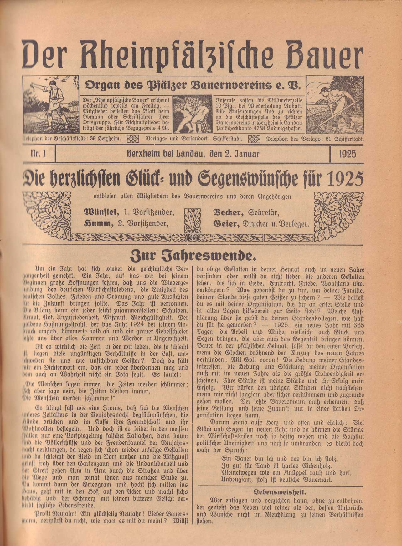 Der Vorstand des Pfälzer Bauernvereins übersendet Segenswünsche für das neue Jahr. Titelseite "Der Rheinpfälzische Bauer" vom 2. Januar 1925. Abb. aus: Der Rheinpfälzische Bauer: Organ des Pfälzer Bauernvereins e. V. 1/1925, S. 1. (Bayerische Staatsbibliothek, 4 Bavar. 3190 t-1924/27) HLB