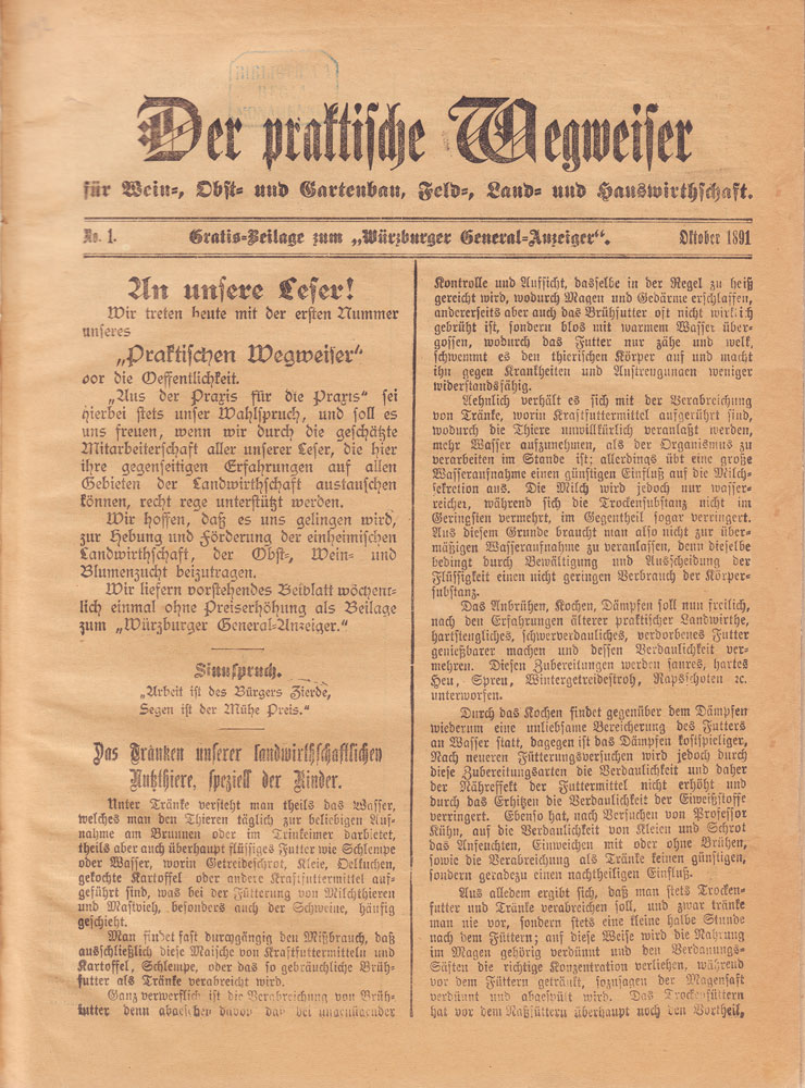 Beilage "Der praktische Wegweiser für Wein-, Obst- und Gartenbau, Feld-, Land- und Hauswirthschaft (Bayerische Staatsbibliothek 4 Oecon. 379 i-1891) HLB