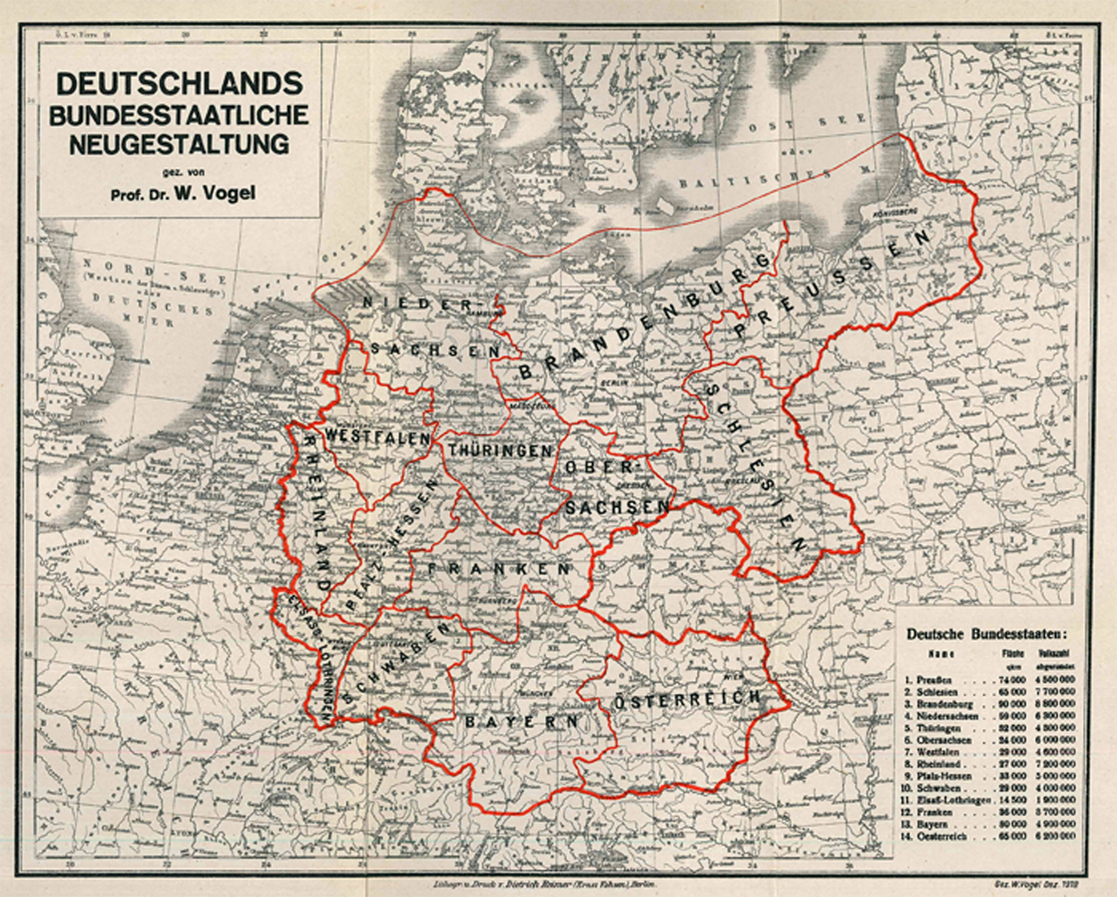 Karte von Walther Vogel zur bundesstaatlichen Neugestaltung Deutschlands (aus: Vogel, Walther: Deutschlands bundesstaatliche Neugestaltung, Berlin 1919.)