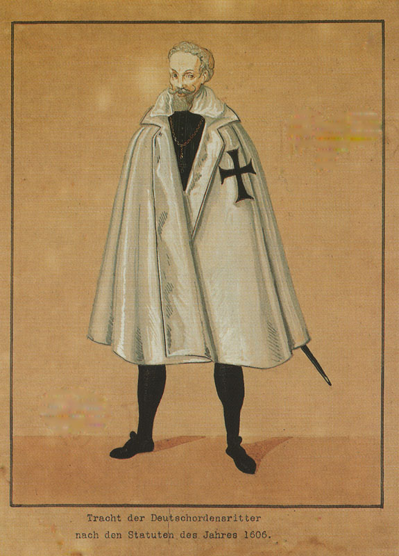 Ein Deutschordenspriester in der Tracht nach den Statuten des Jahres 1606. (Foto: Otto Zink, auch in: Kunstsammlungen des Bistums Regensburg u. Diözesanmuseum Regensburg (Hrsg.): Ratisbona Sacra, Regensburg 1989, S. 461)
