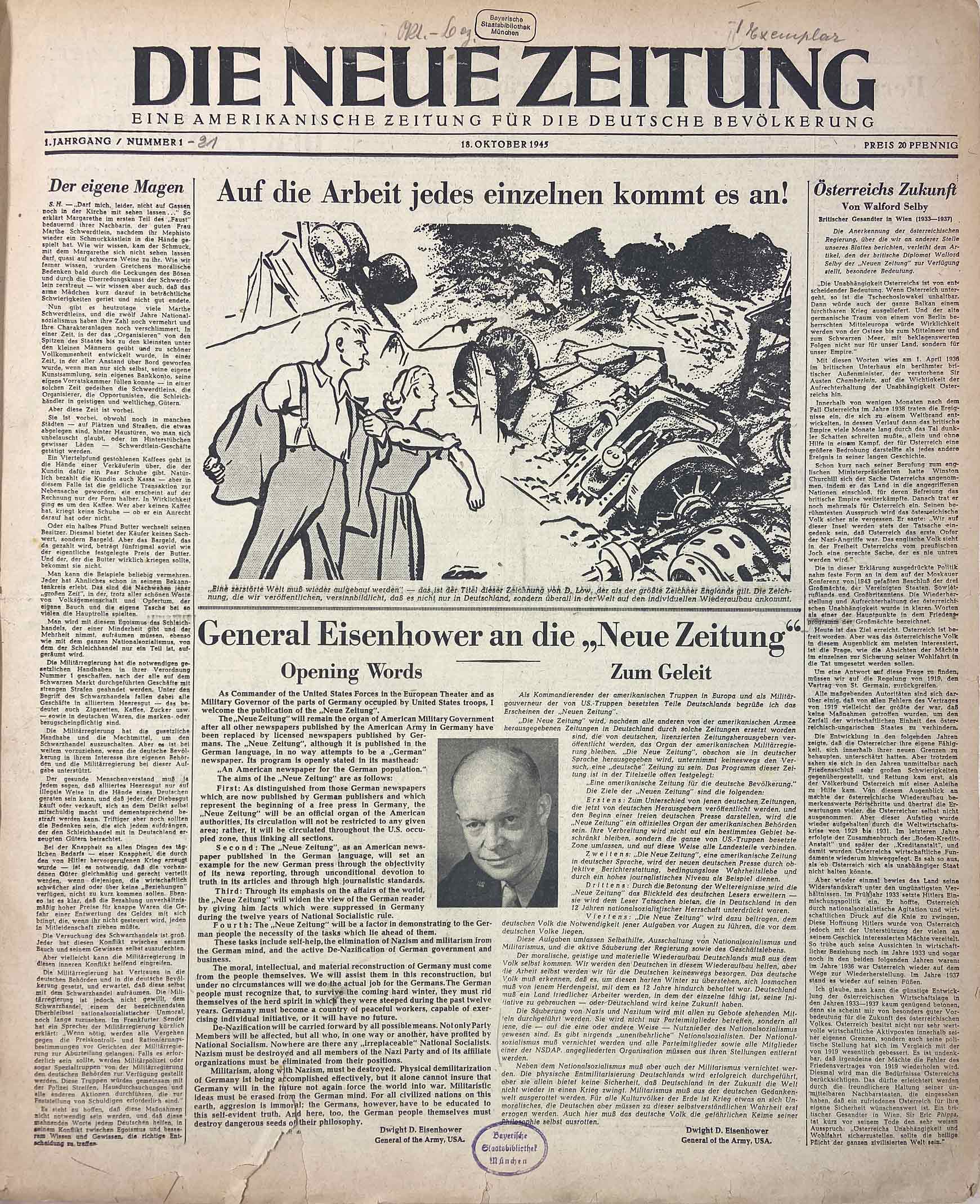 Titelblatt der Erstausgabe der Neuen Zeitung (NZ) vom 18. Oktober 1945. (Bayerische Staatsbibliothek, Bildarchiv hoff-64507) HLB