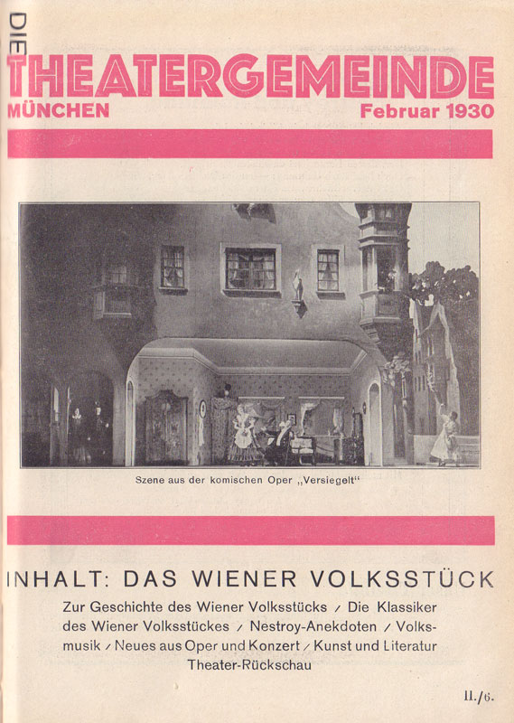 Titelseite der Mitgliederzeitschrift "Die Theatergemeinde München", Ausgabe Februar 1930. Anstelle des stilisierten Theater wurden ab 1930 Fotos von Aufführungen auf der Titelseite gezeigt. (Bayerische Staatsbibliothek, Bavar. 4532 s-1928/31) HLB