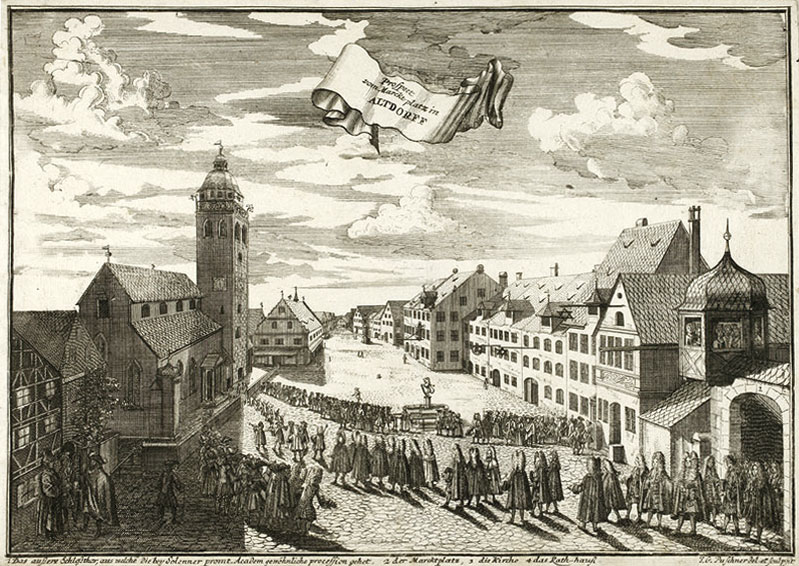 Zug zur Universitäts- und Stadtkirche am Dies academicus. Kupferstich von Johann Georg Puschner (1680-1749). (Stadtbibliothek im Bildungscampus Nürnberg, Stoer. 1208, lizenziert durch Public Domain Mark 1.0) (bavarikon) HLB