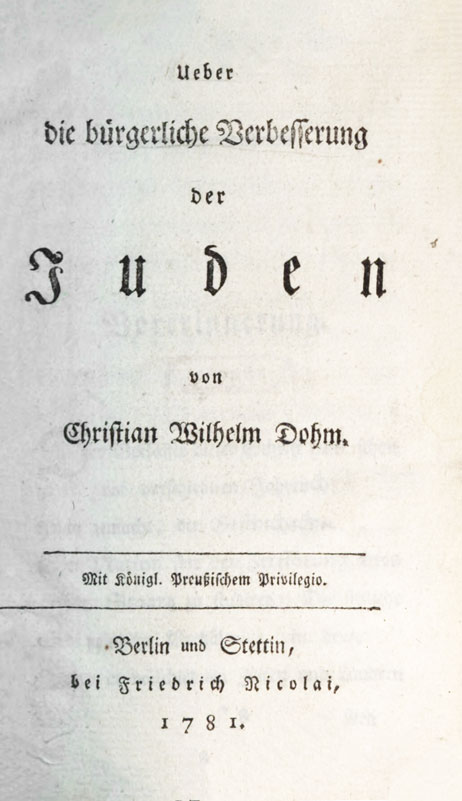 Titelblatt des Buches " Ueber die bürgerliche Verbesserung der Juden" von Christian Wilhelm Dohm. (Bayerische Staatsbibliothek, Jud. 20-1/2) HLB