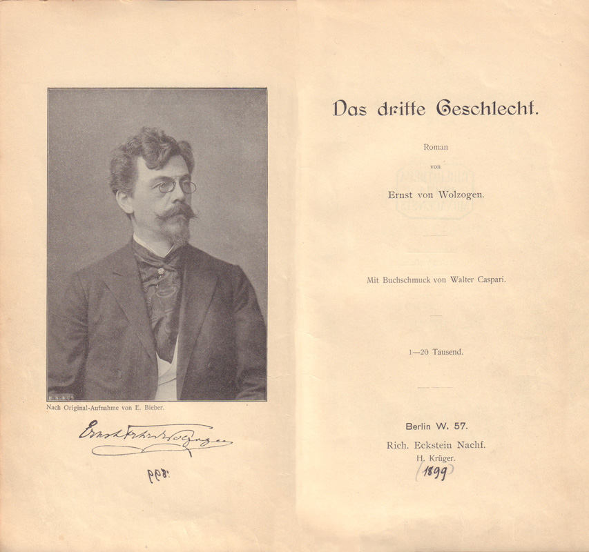 Titelseite des Romans "Das dritte Geschlecht" von Ernst von Wolzogen (1855-1934), Berlin 1899. (Bayerische Staatsbibliothek, P.o.germ. 1639 id) HLB