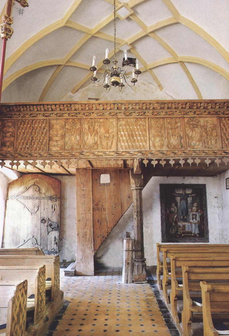 Bergham, Filialkirche St. Valentin, Blick auf die Kerbschnitzempore, das "kümmernis"-Bild und die gotischen Beschläge der Eingangstür. (Foto: Katholische Kirchenstiftung Otterfing) Urheberrechtliche Lizenz muss beim Rechteinhaber eingeholt werden.