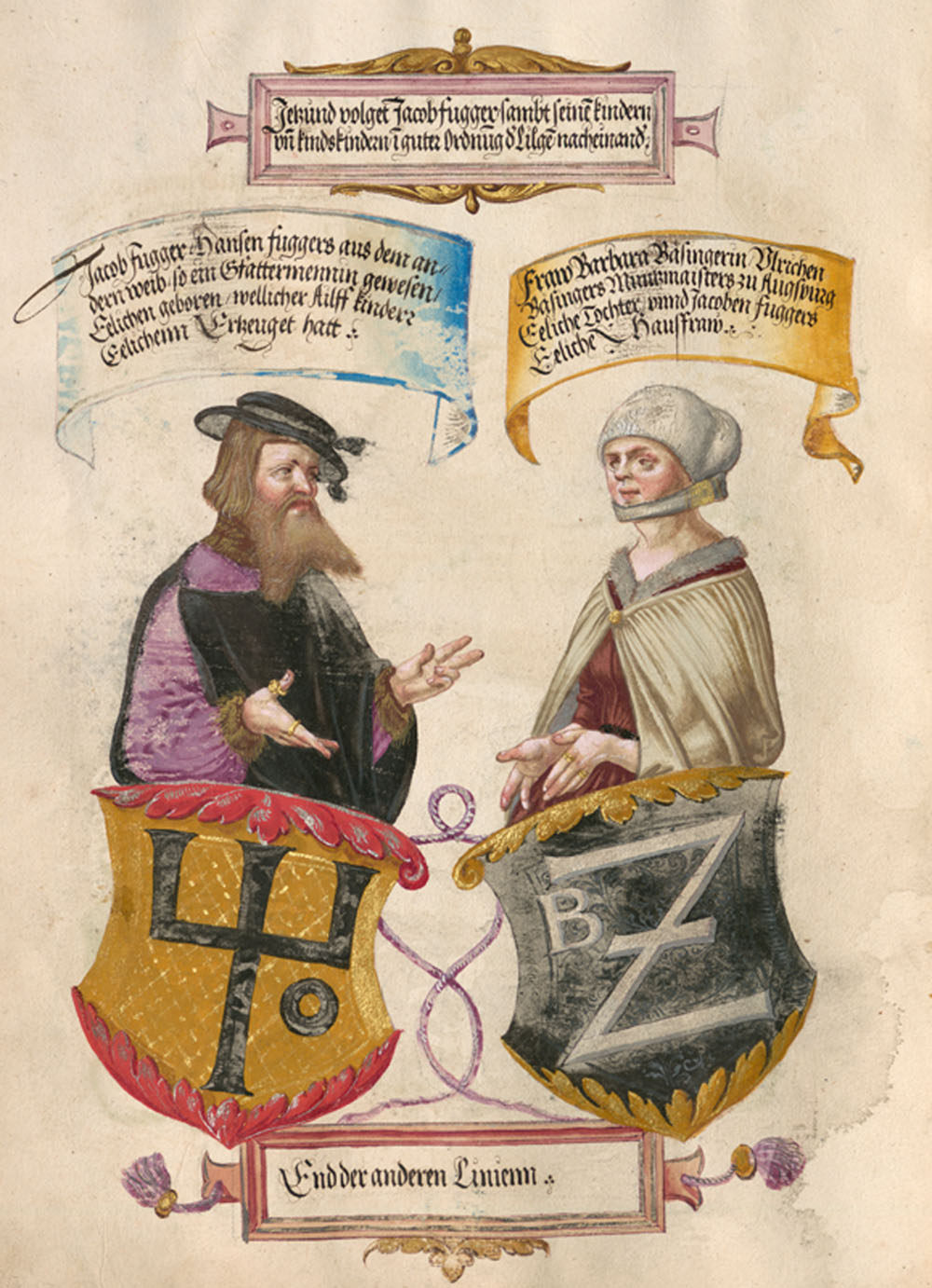 Jakob Fugger 1398-1469), genannt der Ältere, und seine Gemahlin Barbara (1419-1497), geborene Bäsinger. Abb. aus dem Ehrenbuch der Fugger, Augsburg 1545-1547, fol. 28r. (Bayerische Staatsbibliothek, Cgm 9460)