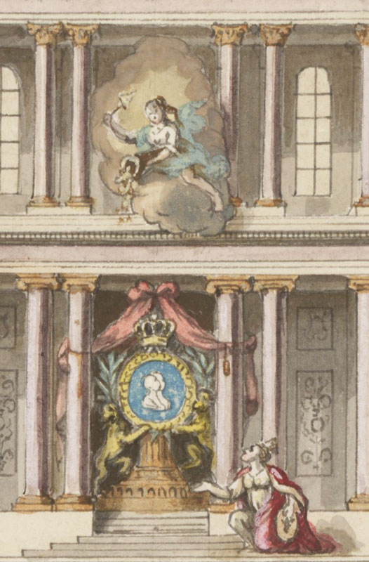 Die Allegorie Tyrolia kniet vor den Medaillon mit Büsten des Königspaares während der "Genius" Bayerns mit seinem Füllhorn Gaben streut. Detail aus der Festdekoration zur Feier der Anwesenheit des bayerischen Hofes. Aquarell von Josef Leopold Strickner (1744-1826), 1808. (Tiroler Landesmuseen, Bibliothek Inv.-Nr. FB 1673/69).