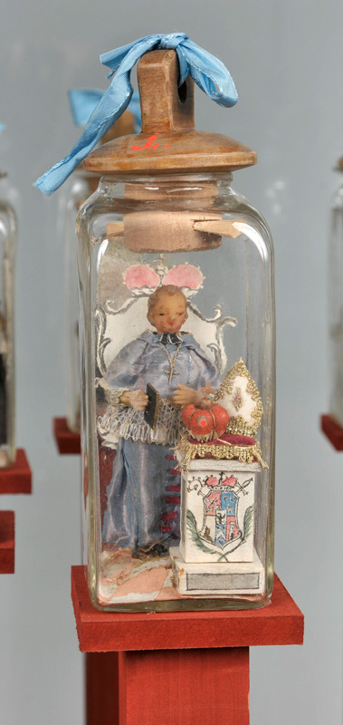 Wachsfigur von Fürstpropst Joseph Conrad von Schroffenberg von Berchtesgaden (reg. 1780-1803) in einer Glasflasche (sog. „Eingricht“), angefertigt von Anna Maria Theresia Fembacher, Ehefrau des Stiftsorganisten, Ende des 18. Jahrhunderts. (Foto: Museum Schloss Adelsheim) HLB