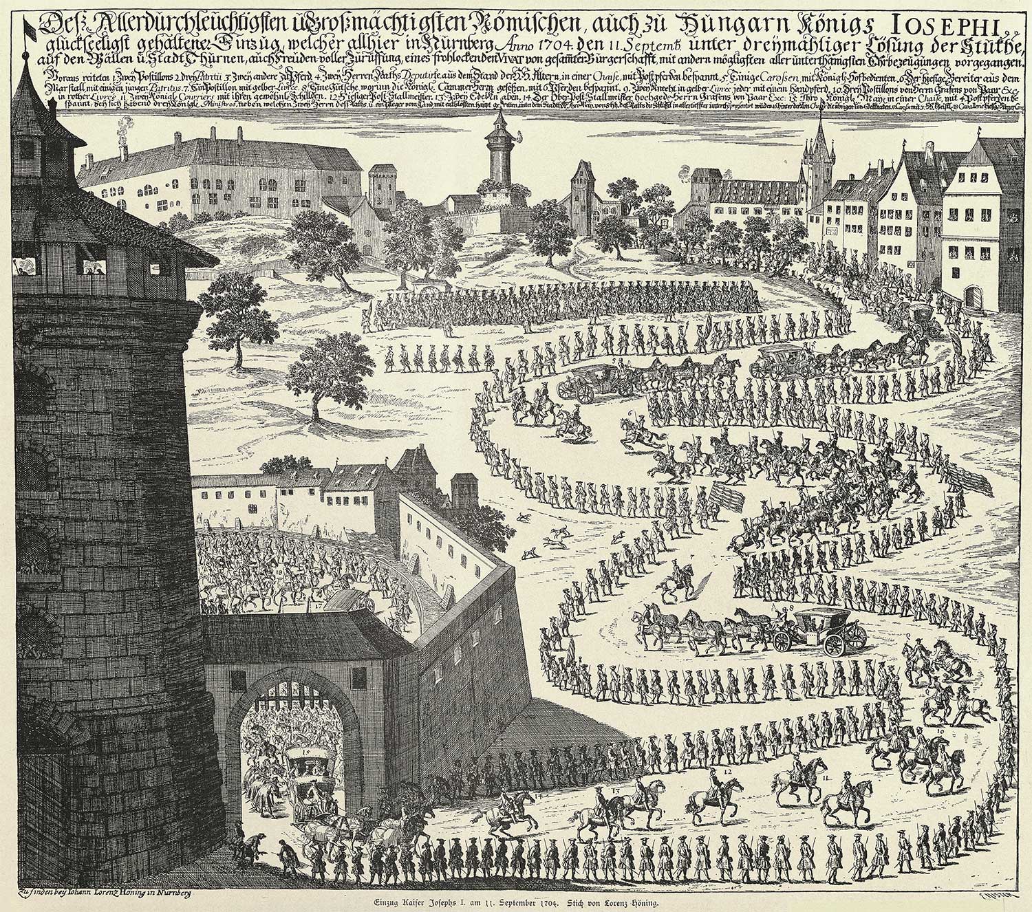 Einzug des späteren Kaisers Joseph I. (reg. 1705-1711) auf der Nürnberger Burg am 11. September 1704. Der Stich zeigt in barocker Manier die einzelnen Teile des Einzuges. Kupferstich von Johann Lorenz Hoening (1674-1713). Abb. aus: Hugo Barbeck, Alt-Nürnberg. Kulturgeschichtliche Bilder aus Nürnbergs Vergangenheit, Bd.13: Kaisertage und Bürgerlust, Nürnberg 1901, Blatt 3. (Bayerische Staatsbibliothek, 2 Bavar. 32 v-11/14)