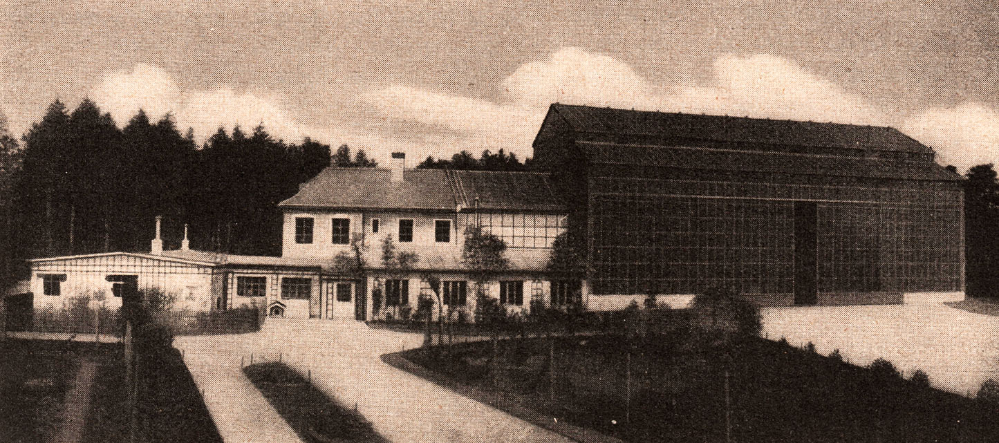 Das Emelka-Atelier in Geiselgasteig mit angebauter Requisitenhalle und Werkstätte um 1927. (aus: Emelka, in: Das Land Bayern. Seine kulturelle und wirtschaftliche Bedeutung für das Reich, München 1927, S. 367)