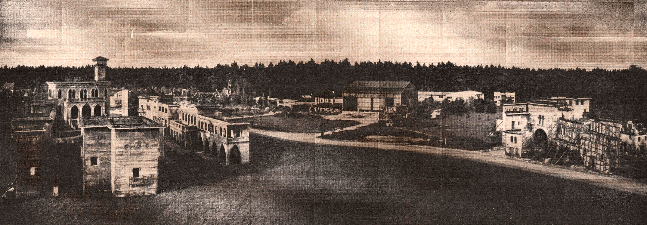Das Emelka-Filmgelände in Geiselgasteig. Im Vordergrund italienische Motive. (aus: Emelka, in: Das Land Bayern. Seine kulturelle und wirtschaftliche Bedeutung für das Reich, München 1927, S. 367)